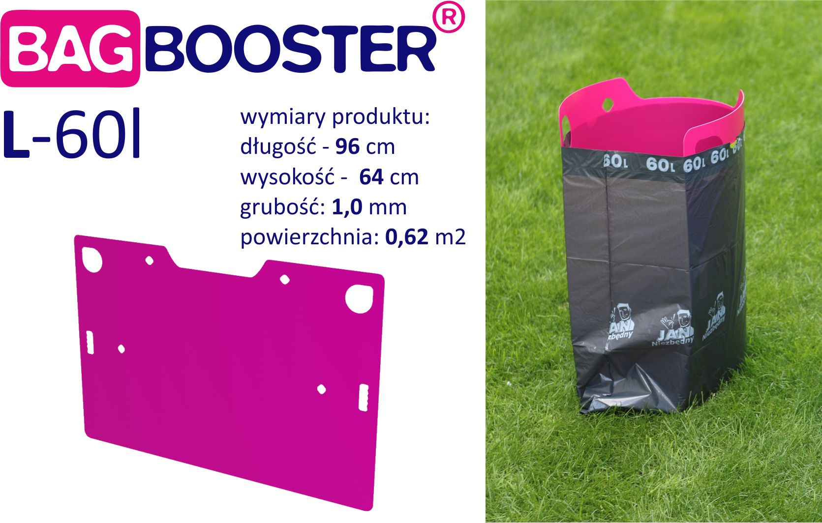 BagBooster L to innowacyjna wkładka do różnego rodzaju worków. Usztywnia i ochrania konstrukcję worka od środka, ułatwiając jego wypełnienie. Z łatwością można zapakować gałęzie, trawę, liście czy odpady budowlane. Idealnie nadaje się do ekologicznego segregowania odpadów. BagBooster L został wyprodukowany ze specjalnej mieszanki polipropylenu dzięki temu włożony do środka worka zachowuje sprężystość jak i sztywność, aby utrzymać na odpowiednim poziomie stabilność worka i zapewnić wysoki komfort użytkowania. Praktycznie nieograniczona ilość możliwości zastosowania. Ogród, dom, działka, plac budowy czy warsztat. Już nigdy pakowanie do worka skoszonej trawy czy liści nie będzie problemem. Wycięte uchwyty i otwory ułatwiają używanie produktu.
